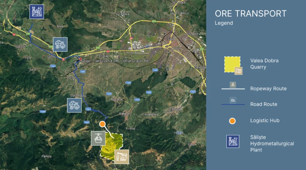 Într-o hartă publicată pe siteul firmei, traseul este prezentat mai detaliat. Cariera din Valea Dobra apare în zona montană de la sud-vest de Rășinari, legată printr-o rută de tip ropeway de un punct logistic amplasat la marginea localității. Din acel hub, harta indică mai departe un traseu rutier care trece prin zona Gura Râului – Orlat – Săcel și continuă până la Săliște, unde compania marchează amplasamentul unei viitoare uzine hidrometalurgice.