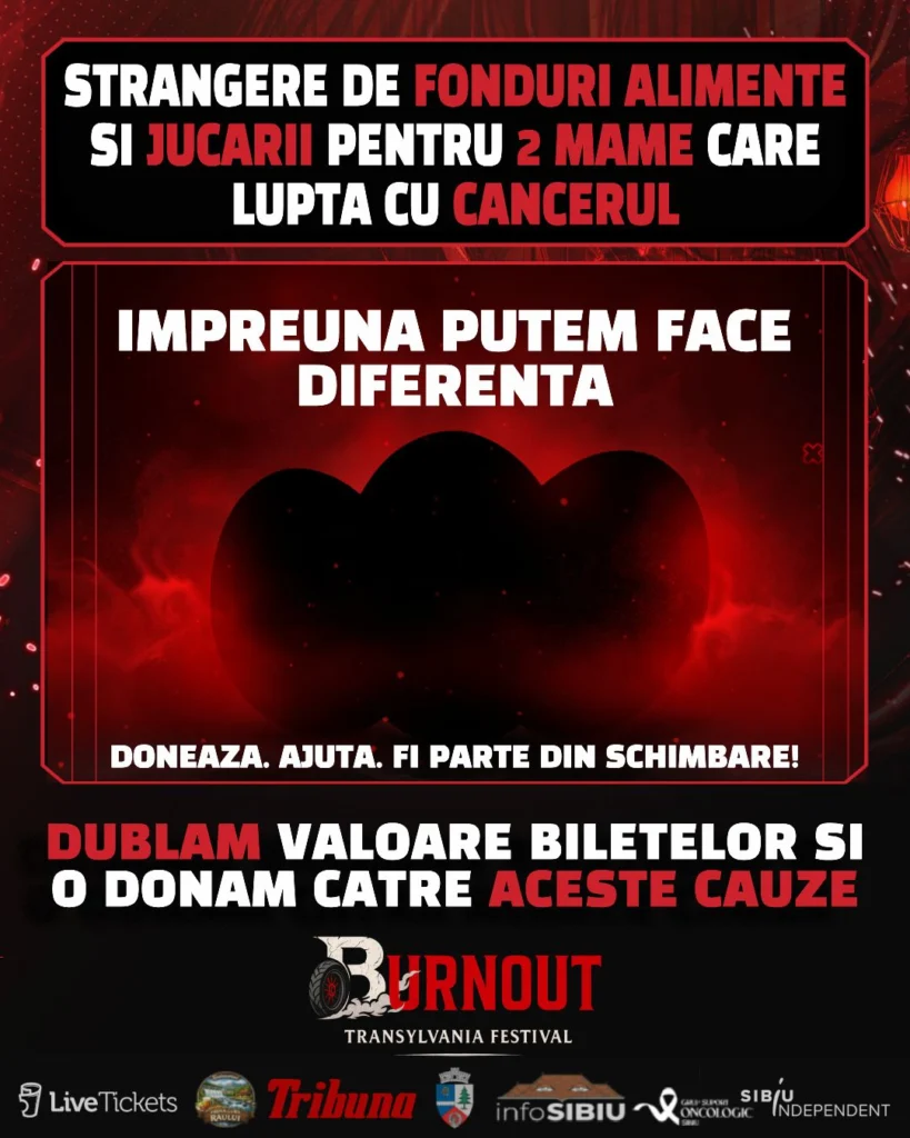Organizatorii Burnout Transylvania Festival, Vulcu Andrei, Baiceanu Andrei și Raimond Faraon, au anunțat lansarea unei campanii umanitare dedicate sprijinirii a trei mame care luptă cu cancerul și a copiilor acestora. Sub mesajul „Împreună putem face diferența”, inițiativa urmărește mobilizarea comunității locale și a tuturor celor care vor să ofere ajutor concret unor familii aflate într-un moment extrem de dificil.