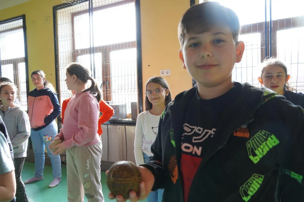 Pe pereți sunt desenate, cu vopsea albă și roșie, câteva „ținte” spre care, rând pe rând, băieți și fete aruncă mingile din piele umplute cu lână. Sunt printre puținii copii din județul Sibiu care mai joacă oină.