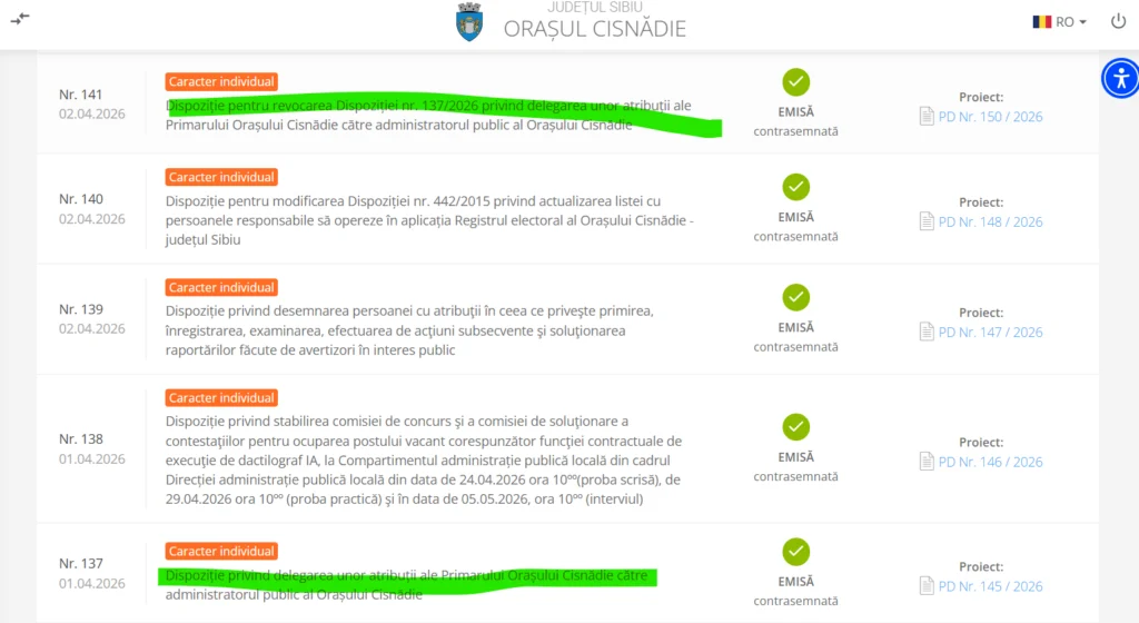Ieri, 1 aprilie, primarul a dat dispoziție nr. 137 prin care își delega competențele de coordonare a compartimentului juridic, contencios administrativ către administratorul public Oana Ungur. Astăzi, în urma scandalului, unde a fost implicată și Oana Ungur, făcută cu ou și cu oțet de primar în biroul său, conform martorilor cu care a discutat reporterul SIBIU INDEPENDENT, i s-a retras această atribuție dată ieri, prin dispoziția 141.
