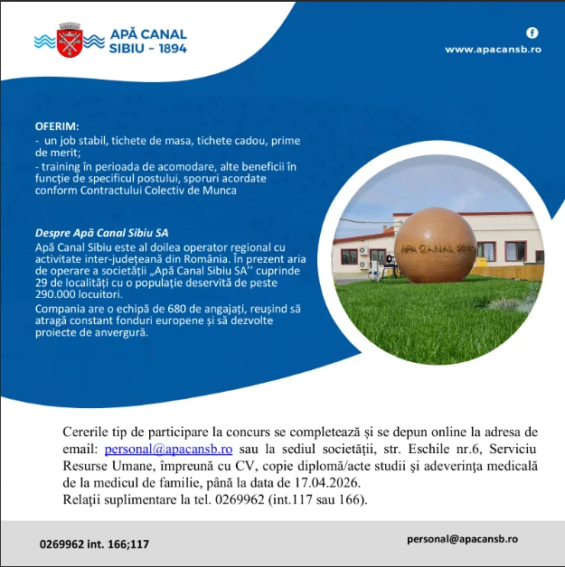 Cei interesați pot depune cererile de participare la concurs până la data de 17 aprilie 2026, fie online, la adresa de e-mail personal@apacansb.ro, fie direct la sediul societății din Sibiu, strada Eschil nr. 6, la Serviciul Resurse Umane. Dosarul trebuie să includă CV-ul, copia diplomei de studii și adeverința medicală eliberată de medicul de familie.