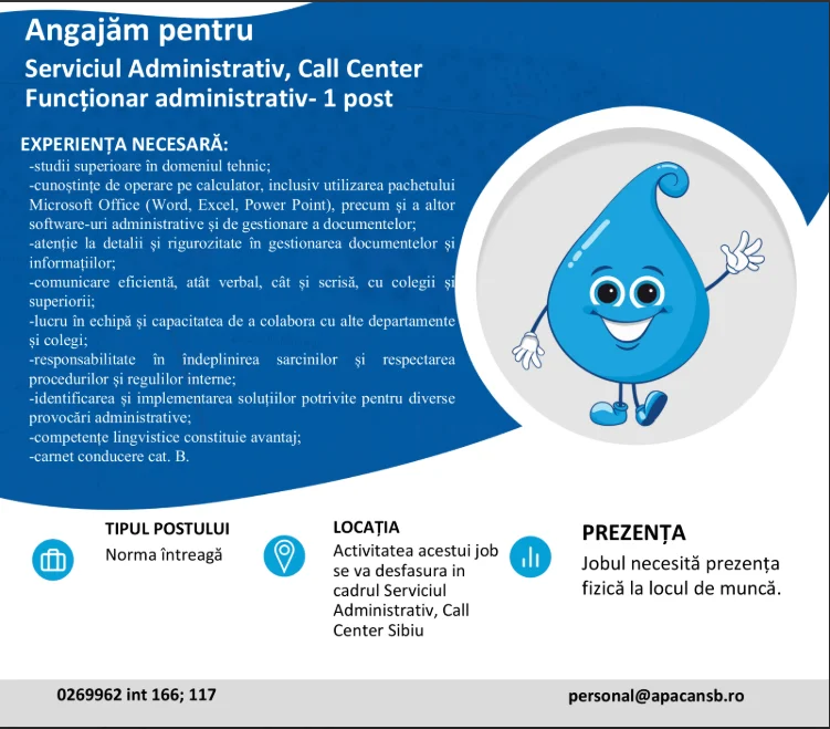 Apă Canal Sibiu S.A. a anunțat deschiderea unui post de funcționar administrativ în cadrul Serviciului Administrativ – Call Center, oferind oportunitatea angajării pentru candidații cu studii superioare în domeniul tehnic.