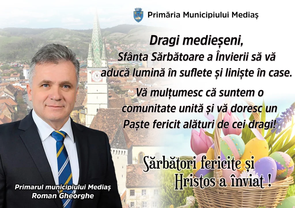 Primarul municipiului Mediaș, Roman Gheorghe, a transmis un mesaj cu ocazia Sărbătorilor Pascale, adresat tuturor locuitorilor orașului.