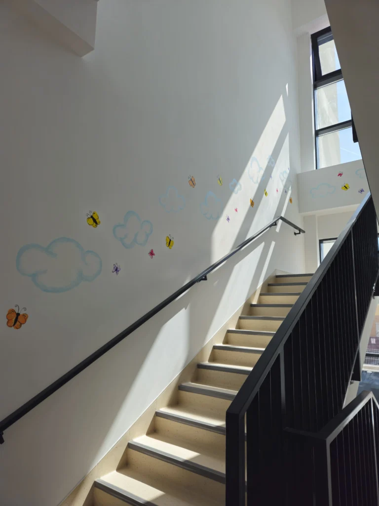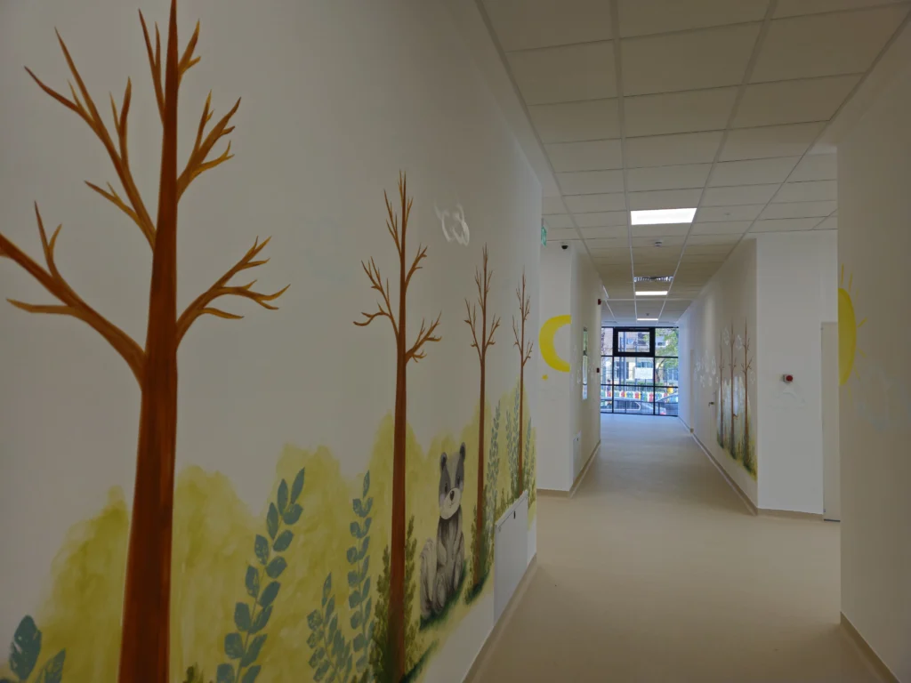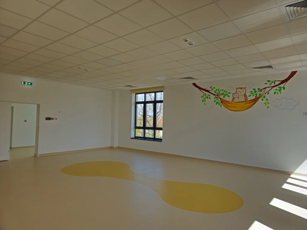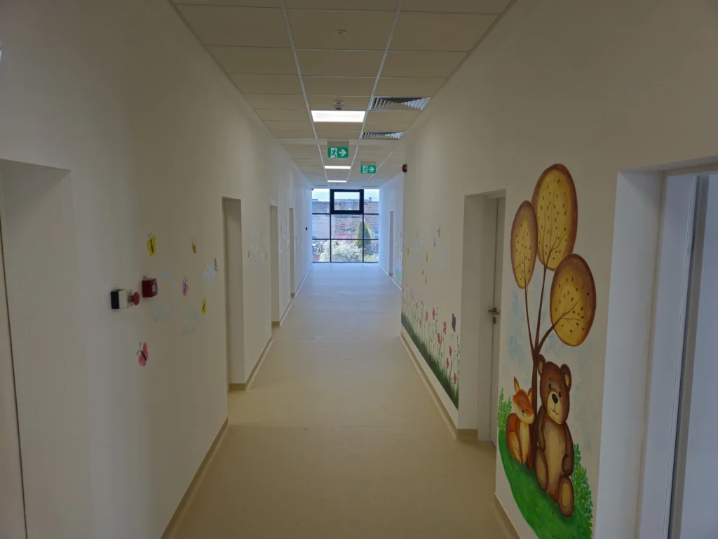 Cu o suprafață de 1.650 mp, clădirea a fost gândită pentru a separa fluxurile celor mici parterul care aparține creșei este dotat cu 3 săli de grupă, cabinet medical, izolator și o zonă specială pentru depozitarea cărucioarelor. Etajul este dotat cu 3 săli de clasă moderne și zone multifuncționale pentru masă, iar subsolul găzduiește o bucătărie complet utilată, spălătorie și un adăpost de protecție civilă.