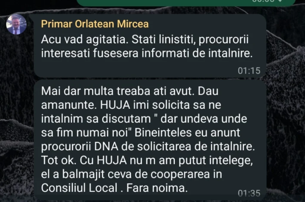 Din discuțiile anterioare de pe grup reiese clar că niciunul din consilieri nu știa de întâlnire. Primarul Orlățan a scris consilierilor că Huja i-a solicitat primarului o întâlnire față în față „dar undeva unde să fie numai noi”. Primarul a acceptat și a spus că a anunțat procurorii DNA.