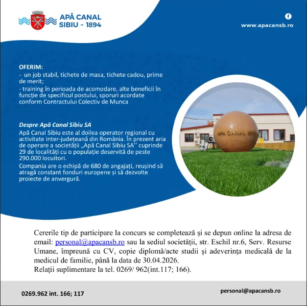 Prin această recrutare, Apă Canal Sibiu își propune să susțină activitatea operațională din zona Ocna Sibiului și să mențină standardele serviciilor oferite comunității.