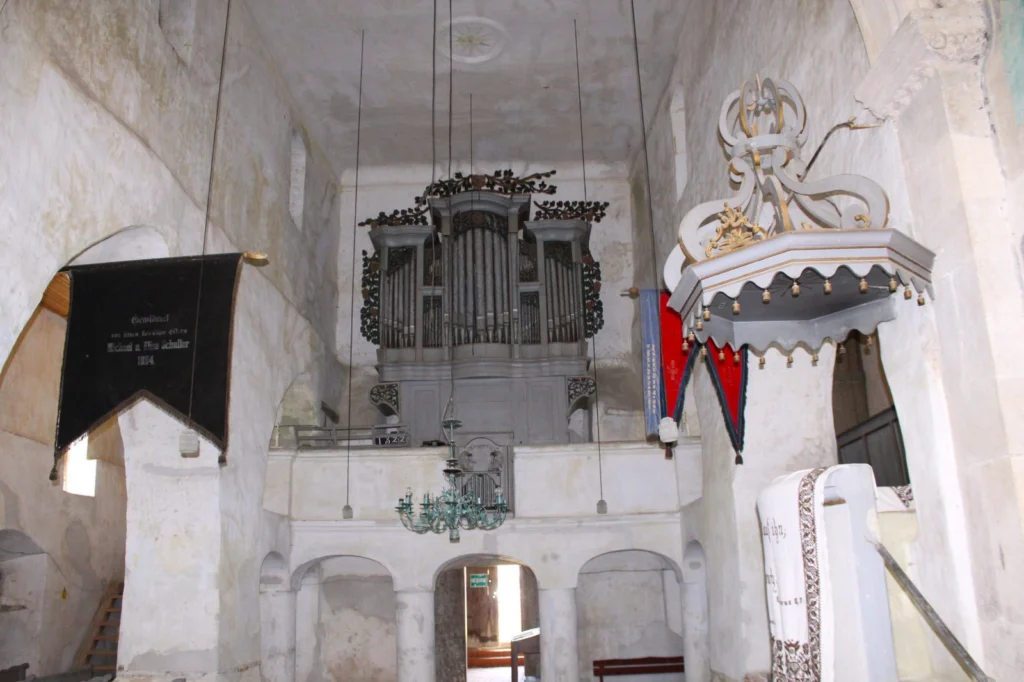 Ajungem și la orga încă funcțională. „Aceasta era metoda prin care se transmitea aerul produs în burduf către orgă, pentru a putea cânta. O persoană stătea aici tot timpul cât se cânta și trebuia să acționeze această pedală pentru a produce aer”, spune Dana Crișan, apăsând ritmic pe o grindă din lemn de care este agățat un bolovan pe post de contragreutate.