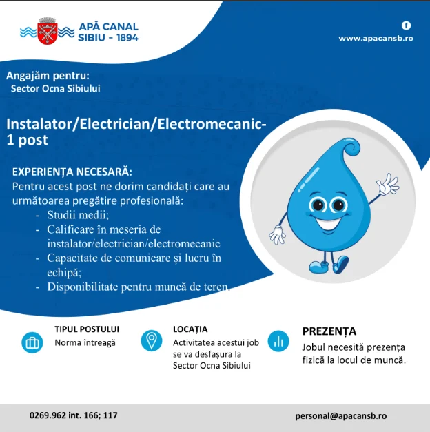 Prin această recrutare, Apă Canal Sibiu își propune să susțină activitatea operațională din zona Ocna Sibiului și să mențină standardele serviciilor oferite comunității.