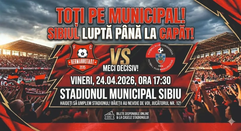 AFC Hermannstadt face apel la suporteri să fie prezenți în tribune, nu în fața televizoarelor. Fiecare loc ocupat poate pune presiune pe adversar, iar fiecare voce poate oferi energie suplimentară echipei. Mesajul este clar: echipa are nevoie de susținere totală în acest moment crucial.