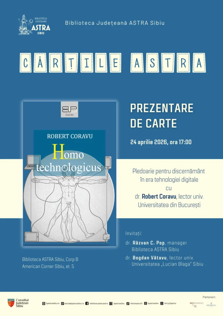 Seria evenimentelor continuă vineri, 24 aprilie 2026, de la ora 17:00, cu lansarea volumului „Homo technologicus”, semnat de lect. univ. dr. Robert Coravu, în cadrul proiectului „Cărțile ASTRA”. Cartea abordează teme actuale precum impactul tehnologiei asupra memoriei, relațiilor și creativității, invitând la reflecție asupra transformărilor societății contemporane.