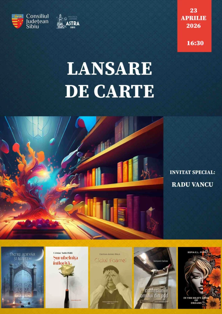 În aceeași zi, de la ora 16:30, la American Corner Sibiu vor fi lansate cele mai recente volume apărute la Editura Bibliotecii ASTRA, în Colecția ASTRE. Publicul va avea ocazia să îi întâlnească pe tinerii autori Sara Ciucur, Sofia L. Popa, Radu Pitariu (Beniamin Belcec) și Cristian Andrei Băilă, ale căror lucrări explorează universuri literare diverse, de la poezie la proză. Invitat special va fi scriitorul Radu Vancu.