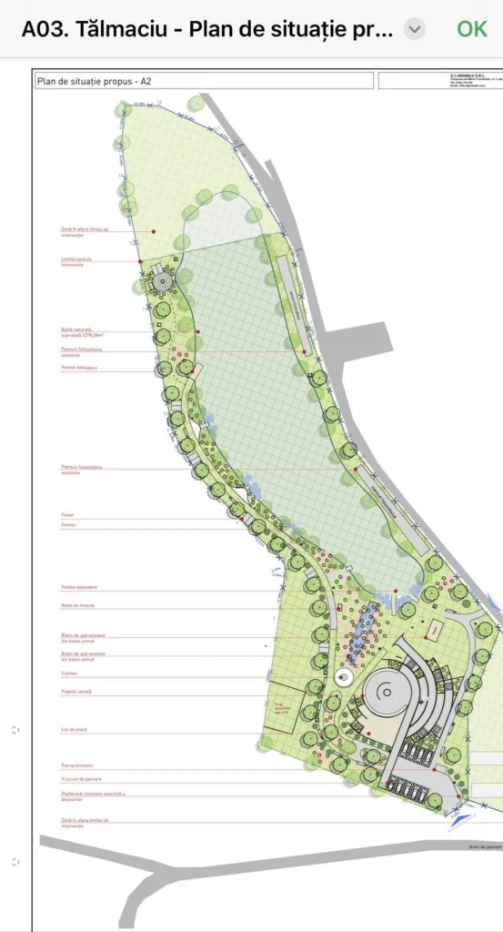 Intervențiile propuse includ demolarea construcției degradate existente, ecologizarea terenului și valorificarea elementelor naturale deja prezente, precum luciul de apă, vegetația și zonele umede. Planul mai prevede amenajarea de alei pietonale, foișoare, bănci și spații dedicate relaxării.