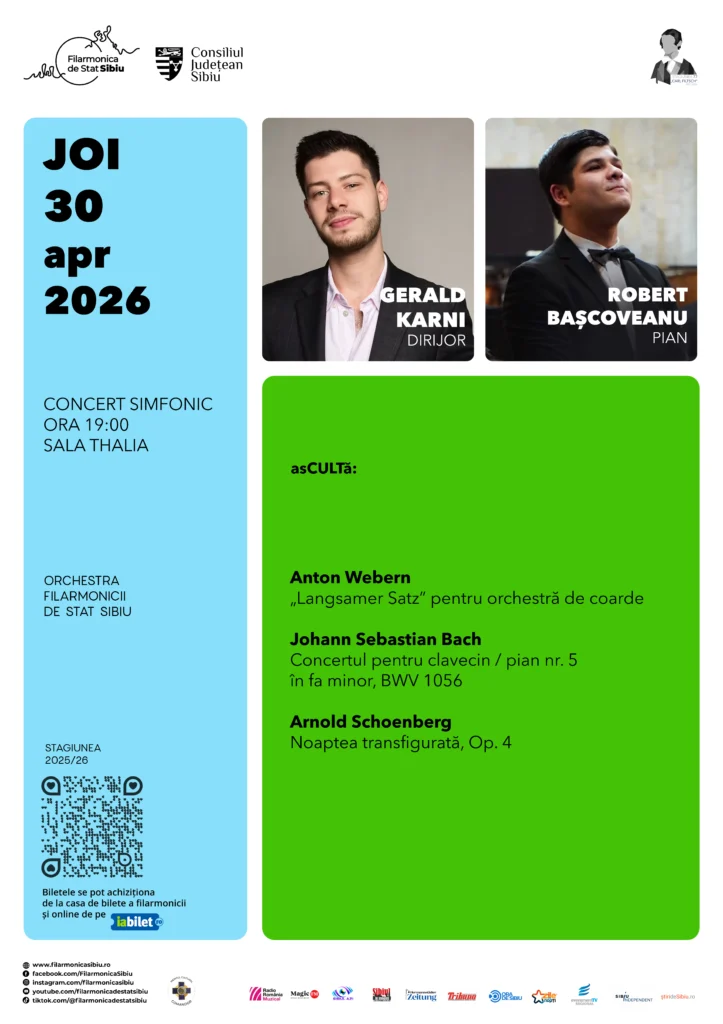 Filarmonica de Stat Sibiu invită publicul joi, 30 aprilie, de la ora 19:00, la concertul care marchează finalul lunii aprilie, un eveniment ce propune o incursiune muzicală de la baroc la modernism. Orchestra Filarmonicii de Stat Sibiu va evolua sub bagheta dirijorului Gerald Karni, alături de pianistul Robert Bașcoveanu.