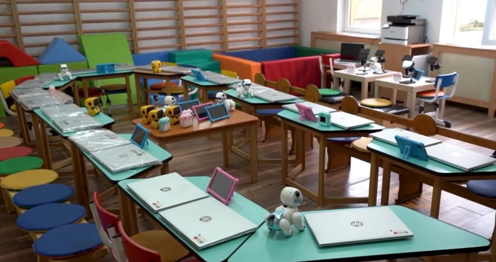 Activitățile fizice sunt susținute prin echipamente dedicate, precum saltele de gimnastică, spaliere, corzi de sărit și alte materiale pentru dezvoltarea motricității. În paralel, componenta digitală a fost extinsă semnificativ: unitatea a primit table interactive, laptopuri, imprimante, camere pentru videoconferință și echipamente moderne precum roboți programabili, kituri de inteligență artificială și ochelari de realitate virtuală.