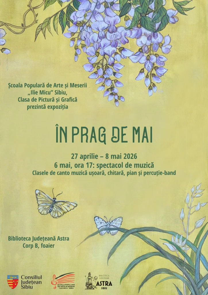 Sibienii sunt invitați să descopere o nouă expoziție de artă plastică găzduită de foaierul Bibliotecii Județene Astra. În perioada 27 aprilie – 8 mai, publicul poate vizita expoziția colectivă „În prag de mai”, ce reunește lucrări de pictură și grafică realizate de cursanții Clasei de Pictură-Grafică din cadrul Școlii Populare de Arte și Meserii „Ilie Micu” Sibiu.