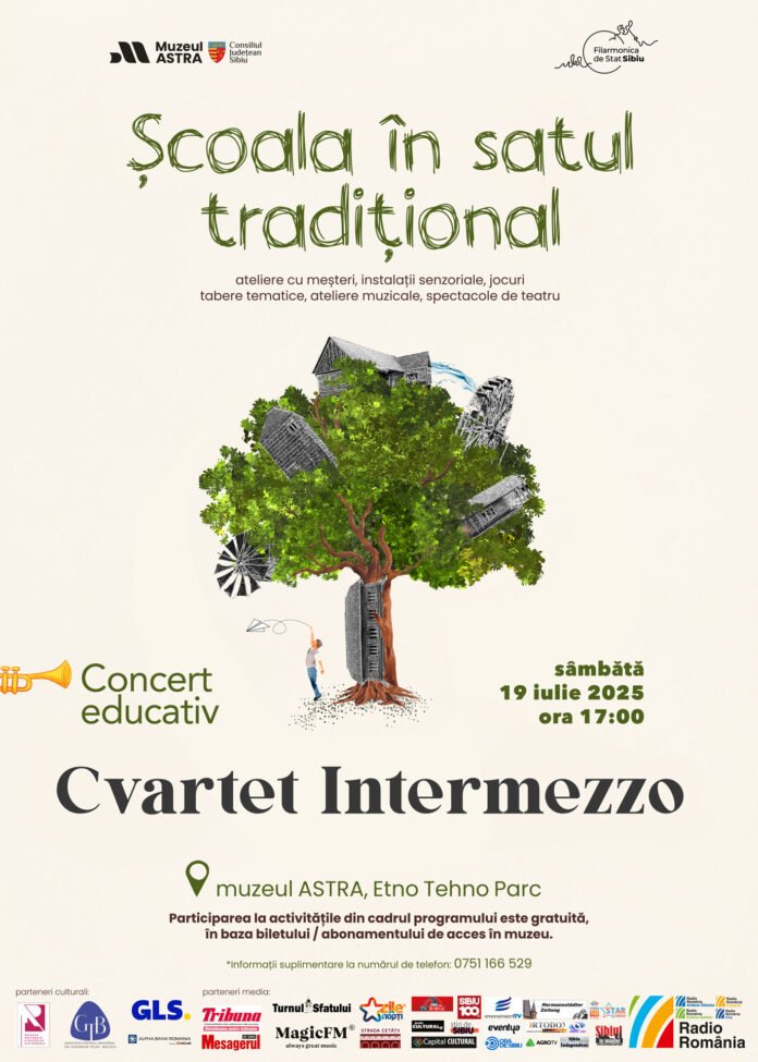 În vacanță la „Școala în satul tradițional”, notele nu sunt trecute în catalog, ci curg armonios din instrumentele Cvartetului Intermezzo. Filarmonica de Stat Sibiu, în parteneriat cu Muzeul ASTRA, îi invită pe cei mici sâmbătă, 19 iulie, de la ora 17:00, la un concert educativ special, organizat la Etno Tehno Parc, în mijlocul naturii și al tradiției.
