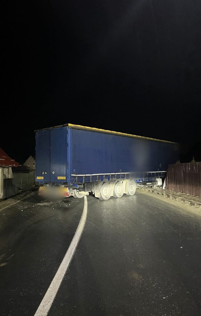 ”În timp ce conducea un ansamblu TIR pe DN 1, pe direcția Sibiu-Brașov, la km 270 + 700 metri, un bărbat în vârstă de 54 de ani, din județul Prahova, pe fondul neadaptării vitezei la condițiile de drum, a pierdut controlul direcției de deplasare și a intrat în coliziune cu un imobil de pe sensul opus de mers, fiind apoi proiectat într-un gard. Ansamblul TIR transporta băuturi alcoolice”, a transmis IPJ Sibiu.