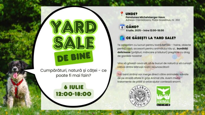 Asociația Animal Life organizează duminică, 6 iulie, între orele 12:00 și 18:00, un eveniment caritabil cu suflet, în inima naturii. Evenimentul „Yard Sale de bine” va avea loc la Pensiunea Michelsberger Haus (Piața Gozelinus, nr. 202) din Cisnădioara. Asociația îi invită pe toți cei dornici să ajute animalele să cumpere lucruri de la eveniment sau să vândă lucruri de care nu mai au nevoie.