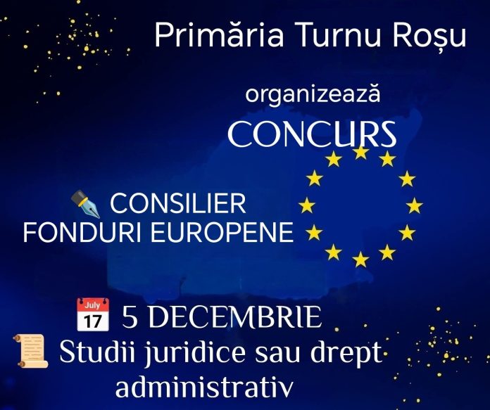 Primăria comunei Turnu Roșu din județul Sibiu a anunțat organizarea unui concurs pentru ocuparea pe perioadă nedeterminată a postului contractual vacant de consilier, grad IA, în cadrul Compartimentului Cultură și Fonduri Europene. În data de 5 decembrie de la ora 10:00 are loc proba scrisă și în data de 10 decembrie de la 10:00 are loc interviul pentru concurs. Concursul se organizează la sediul Primăriei Comunei Turnu Roșu, strada Olteț nr.54.