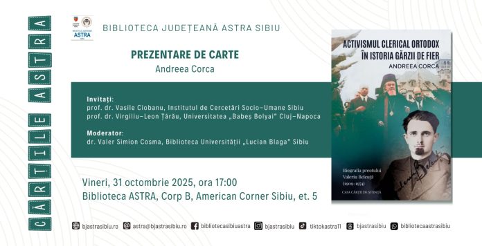 Evenimentul prilejuiește prezentarea volumului „Activismul clerical ortodox în istoria Gărzii de Fier. Biografia preotului Valeriu Beleuță (1909–1974)”, semnat de Andreea Corca, muzeograf în cadrul Muzeului Național Brukenthal. Alături de autoare vor participa prof. dr. Vasile Ciobanu, de la Institutul de Cercetări Socio-Umane Sibiu, și prof. dr. Virgiliu-Leon Țârău, de la Universitatea „Babeș-Bolyai” Cluj-Napoca, iar discuțiile vor fi moderate de dr. Valer Simion Cosma, directorul Bibliotecii Universității „Lucian Blaga” din Sibiu.