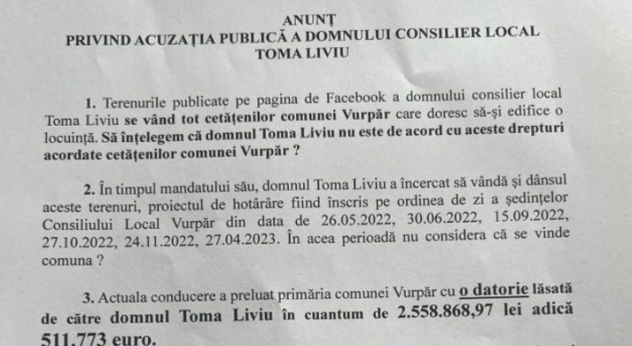 Primăria comunei Vurpăr a transmis public un mesaj privind situația financiară a instituției din ultimii patru ani, în contextul unor acuzații lansate în spațiul public de către consilierul local Toma Liviu.