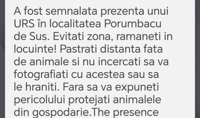 În această seară, pe numărul unic de urgență 112 a fost semnalată prezența unui urs pe raza localității Porumbacu de Sus.