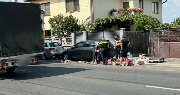 Femeia pieton a avut noroc cu o mașină parcată în zonă, altfel toată greutatea mărfii putea să o strivească. Din fericire, mașina parcată a preluat mare parte din șoc.