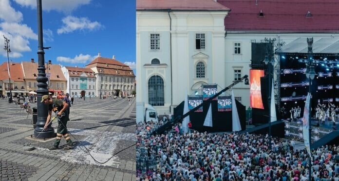 Pentru a face față fluxului uriaș de turiști aflați în Piața Mare a Sibiului, în cele 3 zile de spectacole, compania SOMA a asigurat curățenia, încă din primele ore ale dimineții, trimițând în teren mai mulți angajați.