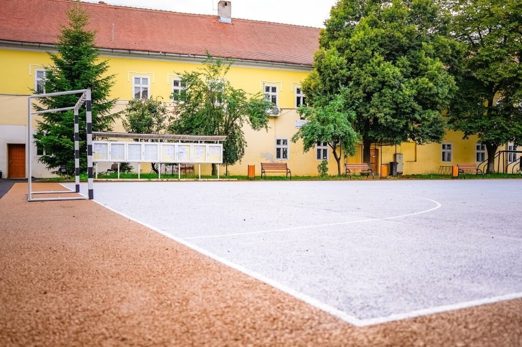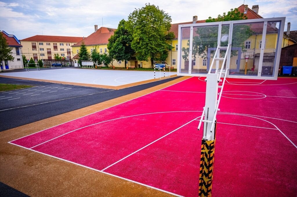 ✓ 2 terenuri de sport: unul de minifotbal, de peste 1000 mp și unul de baschet de 558 mp, a căror suprafață a fostvopsită cu o substanță specială, cauciucată