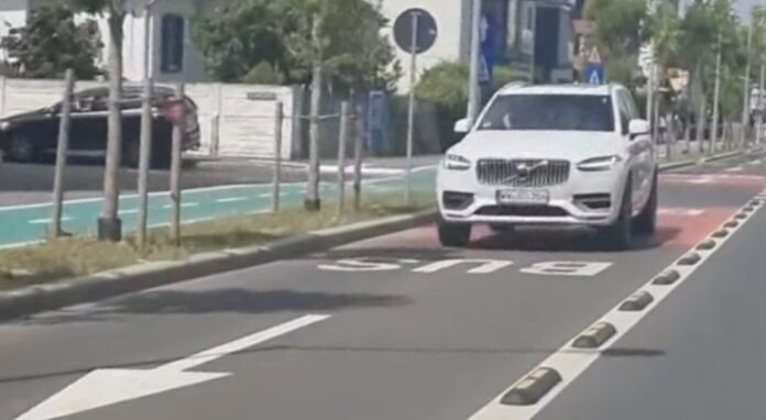 Un șofer a fost filmat astăzi, în timp ce conducea liniștit, pe interzis, pe Calea Dumbrăvii din Sibiu, fix pe banda destinată exclusiv transportului public în comun.