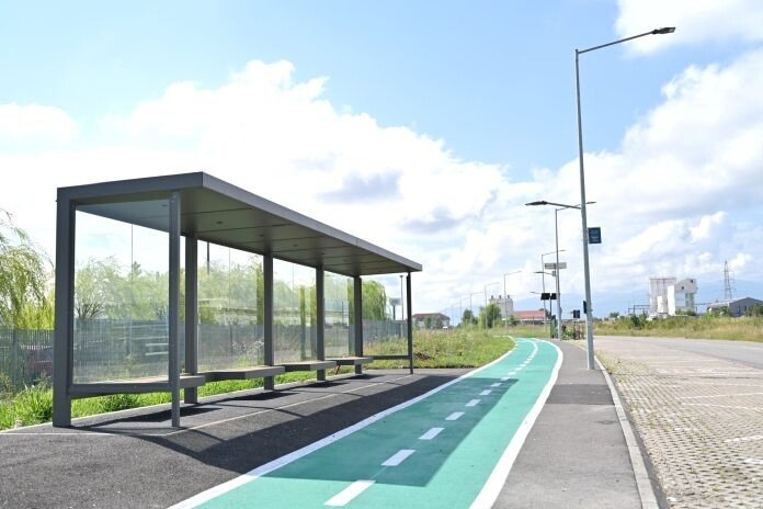 Un drum cu 2 benzi în lungime de aproape 1 km și trotuare pe ambele părți ale străzii