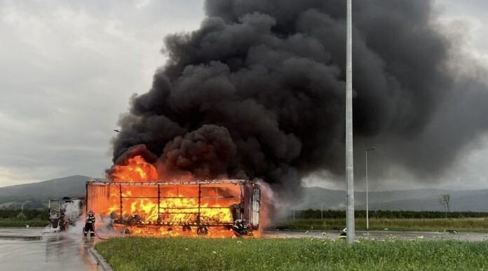Pompierii sibieni au intervenit de urgență pe A1, la ieșirea spre localitatea Boița, într-o parcare pentru stingerea un incendiu izbucnit la un autocamion care staționa.