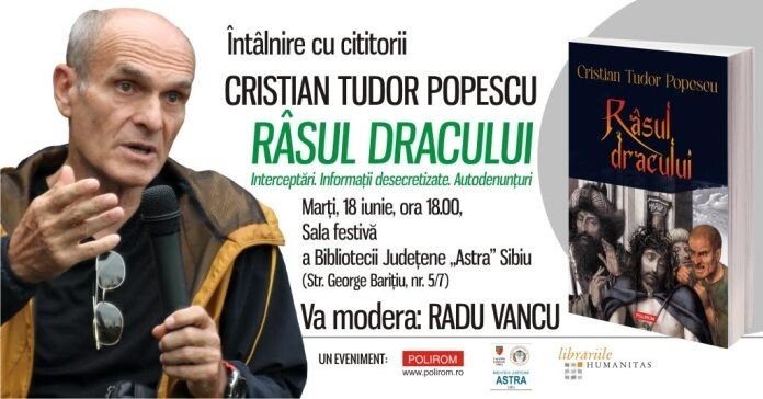 Marți, 18 iunie, de la ora 18.00, în Sala festivă a Bibliotecii Județene „Astra“ Sibiu (Str. George Barițiu, nr. 5/7), cititorii sibieni vor avea ocazia să intre în dialog cu scriitorul și gazetarul Cristian Tudor Popescu în cadrul unui eveniment moderat de Radu Vancu și organizat de Editura Polirom, Biblioteca Județeană „Astra“ Sibiu și Librăriile Humanitas.