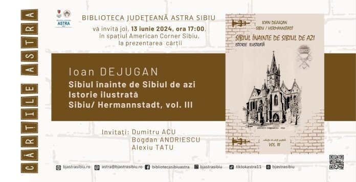 Joi, 13 iunie 2024, Biblioteca Județeană ASTRA Sibiu, găzduiește prezentarea celui de-al treilea volum al seriei „Sibiu/ Hermannstadt”, inititulat „Sibiul înainte de Sibiul de azi. Istorie ilustrată”. Autorul volumului este inginerul Ioan Dejugan, vicepreşedinte al Asociaţiei Filateliştilor din judeţul Sibiu, membru de onoare al Asociației Filateliștilor din România, cunoscut pentru lucrările sale detaliate și documentate dedicate istoriei locale, care contribuie semnificativ la păstrarea și promovarea patrimoniului cultural sibian. Evenimentul se va desfășura începând cu ora 17:00, în spațiul American Corner Sibiu, situat la etajul 5 al bibliotecii publice sibiene, instituție de cultură care se bucură de susținerea financiară a Consiliului Județean Sibiu. Invitați alături de autor vor fi: dl. Dumitru Acu, președintele Asociațiunii Astra, dl. Alexiu Tatu, apreciat istoric al Sibiului și fost director al Serviciului Județean Sibiu al Arhivelor Naționale, și dl. Bogdan Andriescu, șef Serviciu Cercetare în cadrul Bibliotecii ASTRA Sibiu.