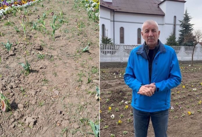 Foto principal: Primarul orașului Dumbrăveni, Emil Dârloșan, alături de panseluțele și sămânța de iarbă de mii de euro, cumpărate la supra-preț.