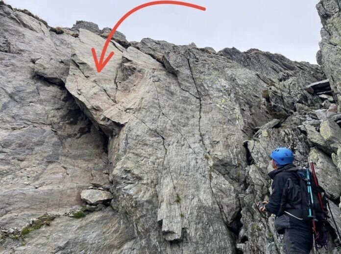 Într-adevăr, acolo mocnește un pericol major, câteva lespezi de șist stau sa cadă, în plus, sunt multe ,,prospături” căzute. Textura stâncii rupte recent ne spune ca acolo e o activitate.
