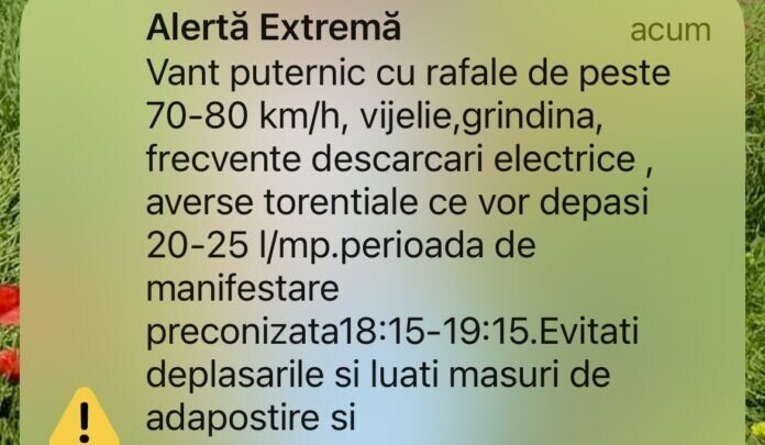 Sunt preconizate vânt puternic cu rafale de peste 70-80 km/h, vijelie,grindină, frecvente descărcări electrice , averse torențiale ce vor depăși 20-25 l/mp.