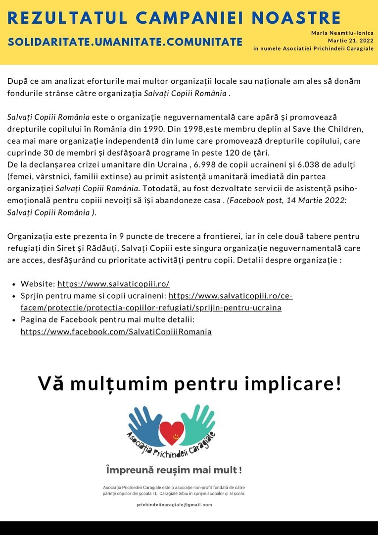„Vremurile pe care le trăim sunt un moment în care putem demonstra, că înainte de orice, suntem oameni, avem suflet și reacționăm la nevoile societății. Prin proiectele demarate în calitate de director adjunct, alături de colegii mei, mi-am dorit să insuflăm și copiilor empatia, bunătatea, iubirea și ideea de a nu rămâne pasivi la ceea ce se întâmplă în jurul lor. Am convingerea că numai așa, împreună, vom reuși! După cum am hotărât, alături de colega mea, director, Anca Rusu, resursele financiare strânse în urma activității se vor îndrepta, săptămâna care urmează, spre Crucea Roșie, având convingerea că vor contribui, măcar puțin, la nevoile celor refugiați” a declarat pentru SIBIU INDEPENDENT, directorul adjunct profesor Cătălina Dumitrean.